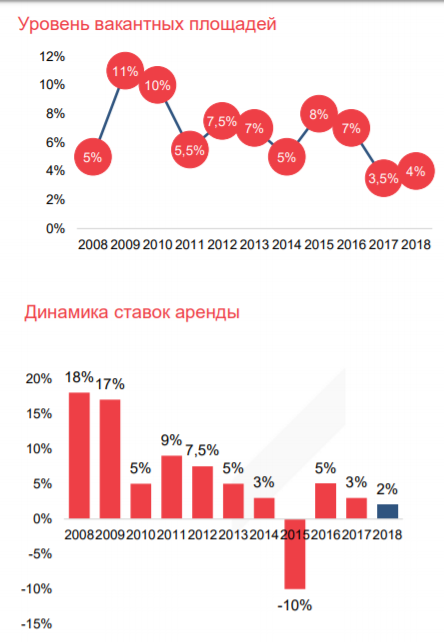 Уровень вакантных площадей в качественных торговых комплексах по итогам первого полугодия 2019 года сохранился на прежнем уровне находится на уровне 3,5-4 %.