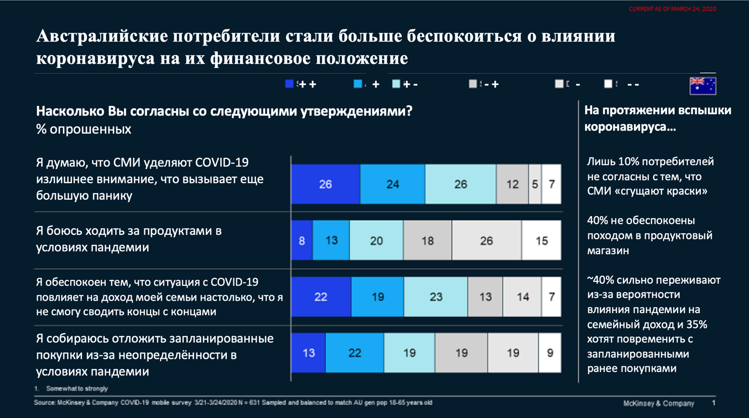 McKinsey продолжит периодически отслеживать потребительские настроения в Австралии и во всем мире. Понимание изменений в поведении покупателей должно быть ключевым приоритетом для любой компании B2C – это необходимо для выявления тенденций новой реальности в условиях пост-пандемии.