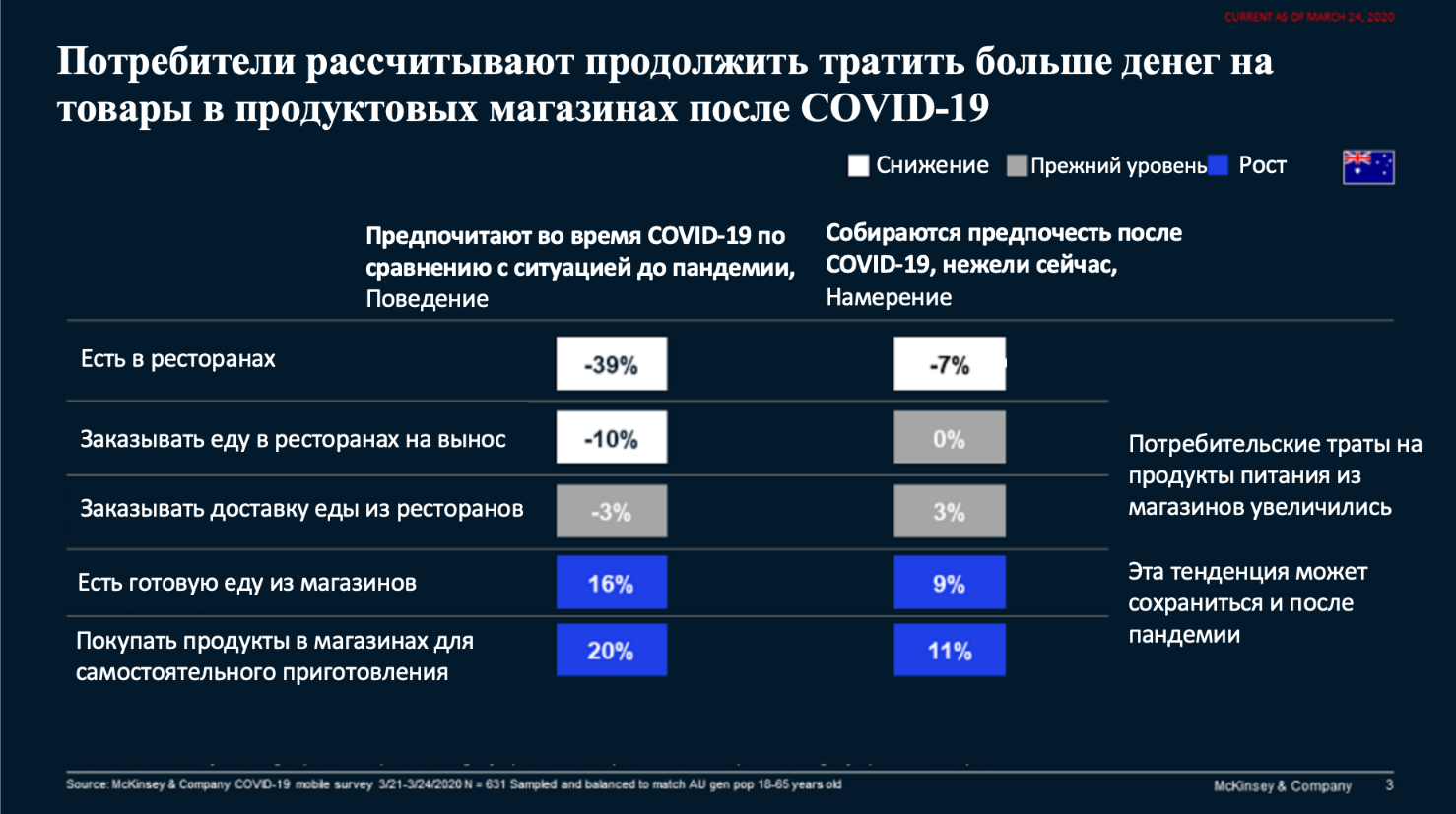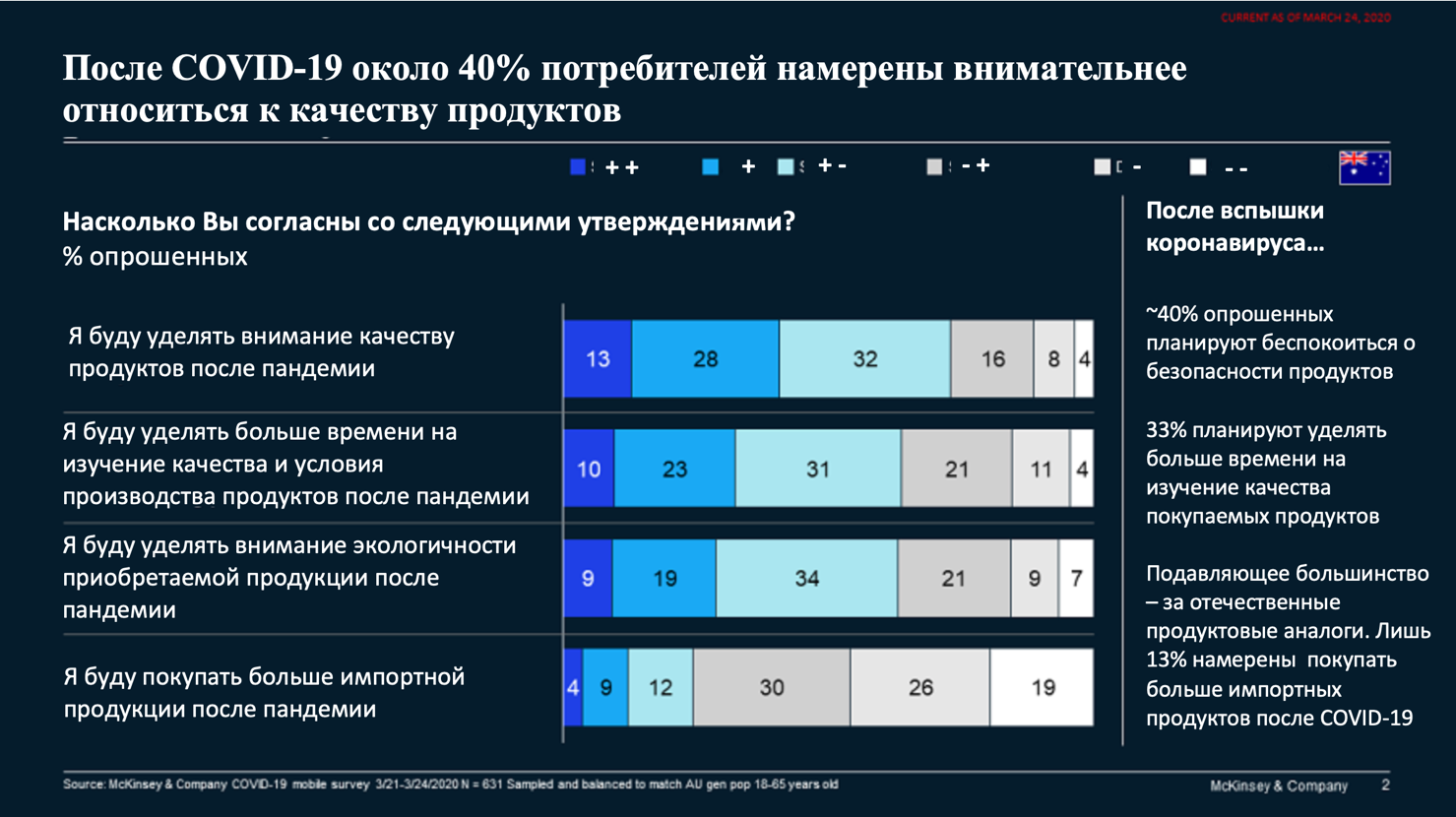 Австралийские респонденты поделились тем, как изменились их пищевые привычки с появлением COVID-19, и предположили, что может измениться в их поведении после пандемии. Данные собирались с 21 по 24 марта 2020 года. В этот период Австралия лишь начинала пожинать плоды коронавируса, и экономическая неопределенность находилась на ранних стадиях. Теперь же в сложных экономических условиях предметом дальнейшего обсуждения, вероятно, станут цены, рекламные акции и скидки.