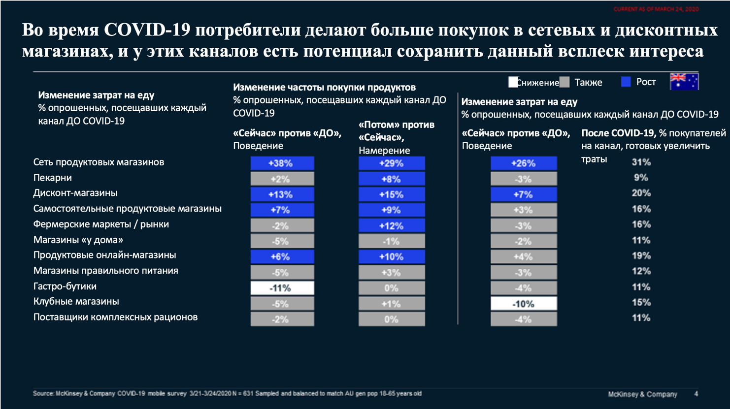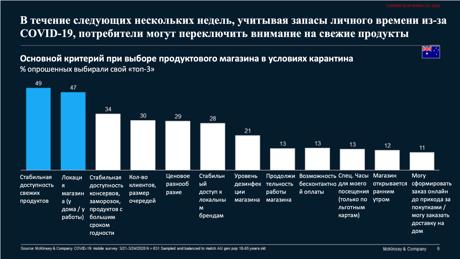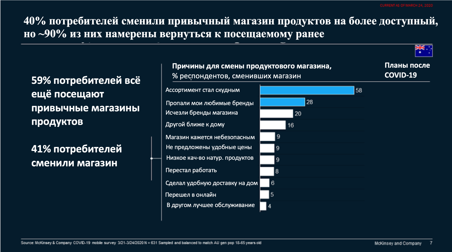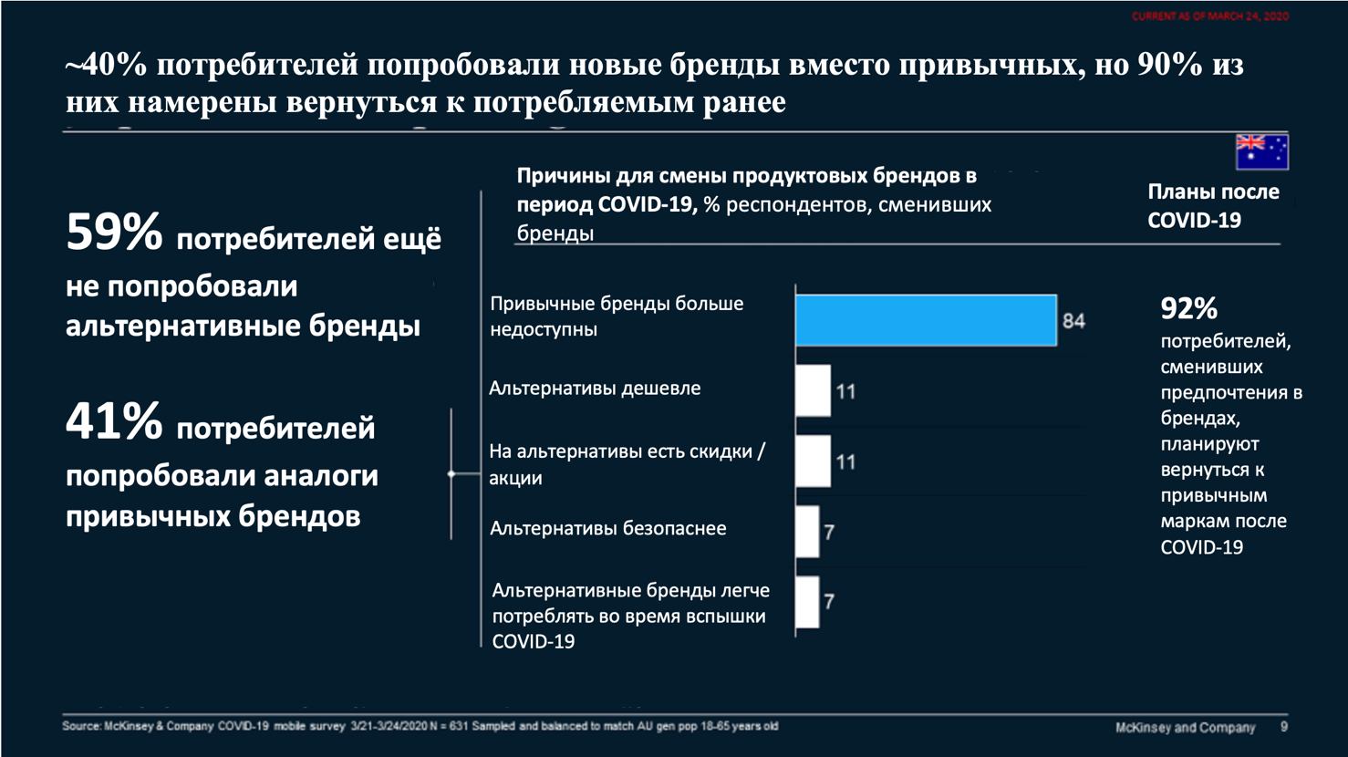 Также поражает столь гибкая лояльность по отношению к привычным брендам и главному продуктовому ритейлеру, знакомому потребителям и вызывающему у них доверие в стабильные времена. В Австралии на 40% возросло количество клиентов, которые стали присматриваться к большему спектру брендов и магазинов, нежели обычно. Тем не менее, ожидается возврат к привычным брендам и локациям более чем у 90% покупателей после пандемии.